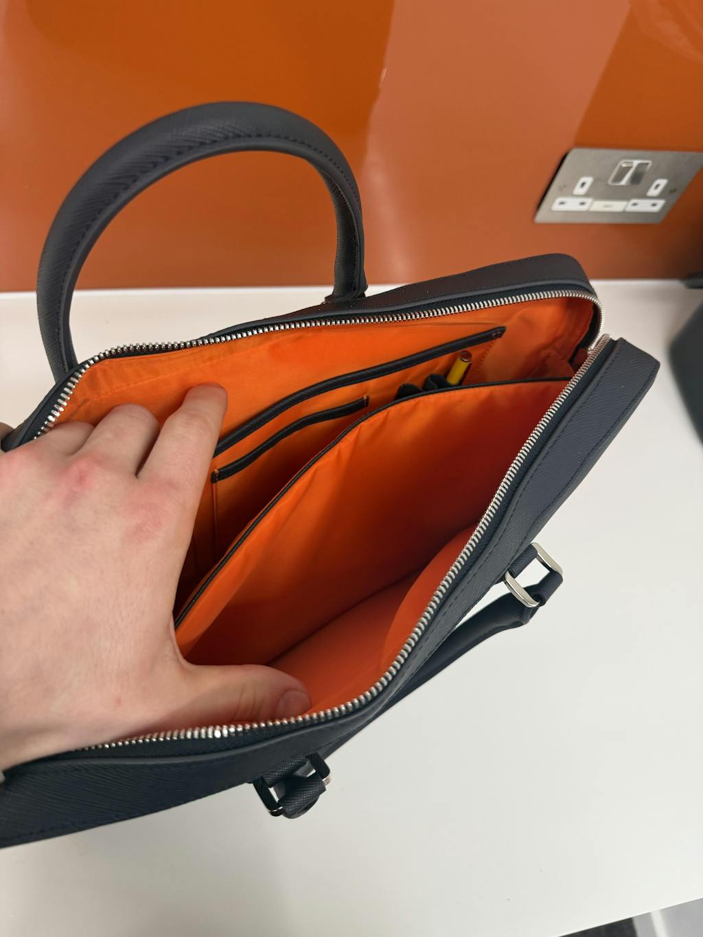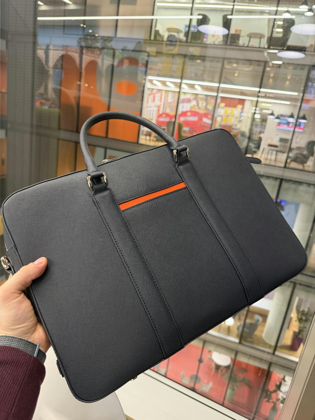 Yes — Saffiano leather is highly scratch-resistant and water-repellent, helping the bag maintain its clean, structured look over time.