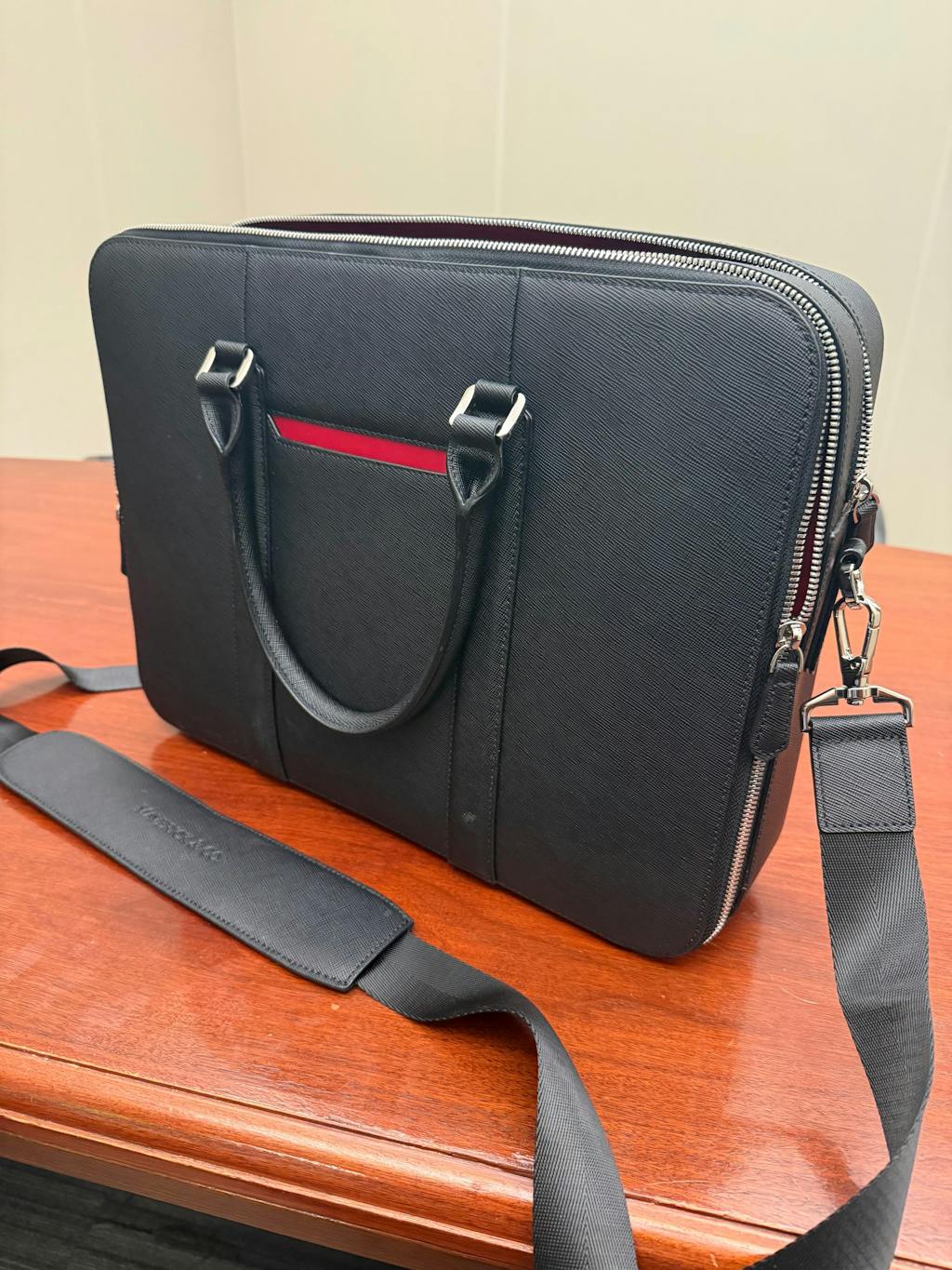 No. The Saffiano leather finish is highly scratch-resistant and water-repellent, helping the bag maintain its clean, structured look even with daily commuting.