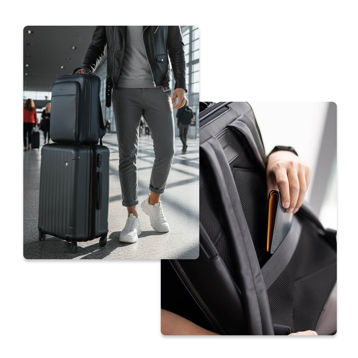La tasca antifurto e la manica per valigia garantiscono un viaggio tranquillo e sicuro nel tuo prossimo viaggio.
